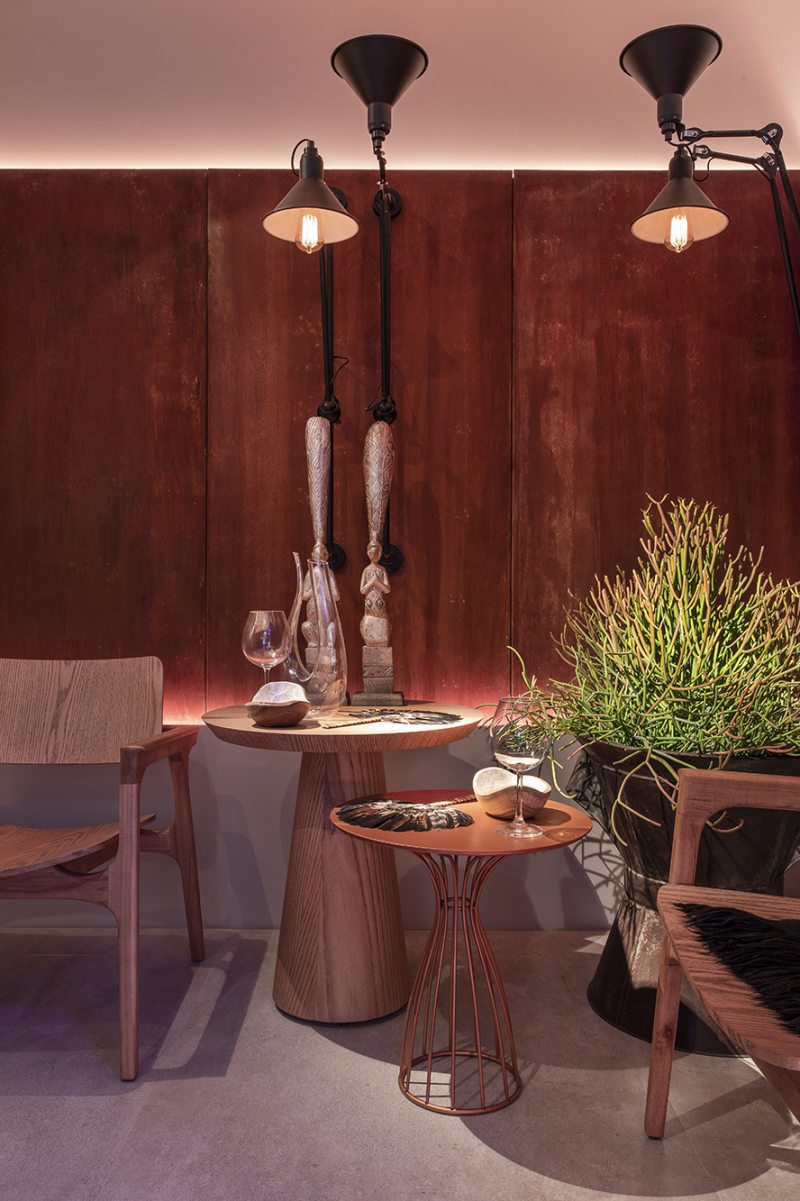 A frase “ Menos internet, mais cabernet”, iluminada por luzes de LED é um convite para os amantes de vinho. Intimista e atraente, os materiais convidam ao toque, como o aço corten nas paredes, e a madeira natural do mobiliário. Peças assinadas se destacam na adega. Inspirado no gosto do vinho, a iluminação é fechada e direcionada para os pontos de destaque.