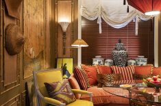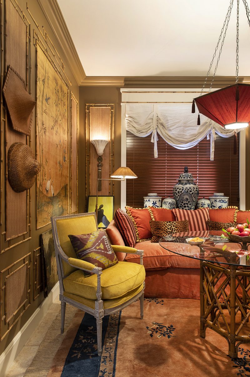 Inspirado na colonização francesa no Vietnã, o arquiteto Paulo Azevedo usa materiais naturais como o bambu e fibra natural. O colorido aparece nos tons de caramelo do bambu, no laranja queimado do sofá e na combinação de azul e branco dos potiches chineses e da tapeçaria. Um par de poltronas francesas Maison Jansen, o aparador campesino e o lustre trazem sofisticação ao espaço.