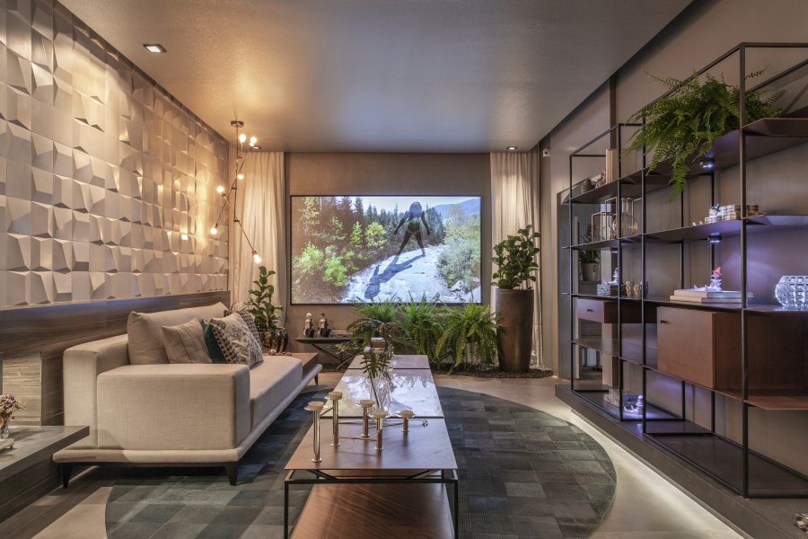 Simone Pedreschi criou um ambiente usual e viável para todos os tipos de casas. O cinza, tonalidade padrão, provoca efeito de sombra e de profundidade. O piso é composto por grandes peças de porcelanato moldadas sobre formas metálicas com acabamento contemporâneo. O ambiente possui por mobiliário aconchegante, lareira ecológica e espaço para bebidas para um bom vinho a dois. Uma janela inesperada surge através da instalação artística de Ana Isméria Velludo e Maysa Pettes, com sobreposição de fotoarte à panorâmicas feitas no Alasca.