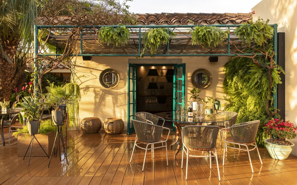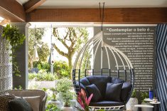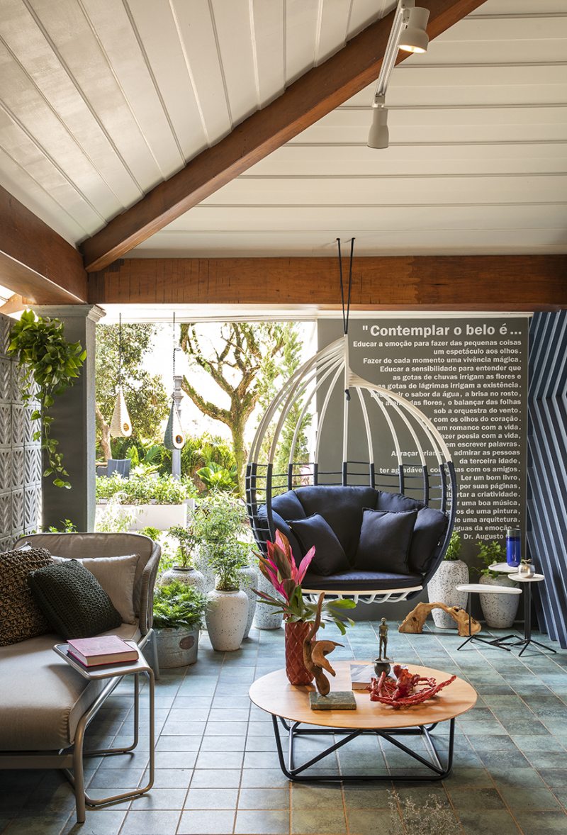 Para a designer de interiores Sarita Ávila, a varanda é um refúgio que oferece sensação de bem-estar e contemplação do belo. No piso, o porcelanato traz o verde esmeralda para colorir com sofisticação, complementado pelo painel de padrões em MDF na cor azulão. A iluminação natural cria formas contemporâneas quando atinge os cobogós. A marcenaria traz desenhos inspirados em folhagens, e o paisagismo conta com espécies tropicais, além do mobiliário assinado por designers brasileiros.