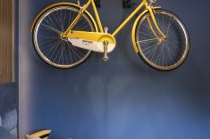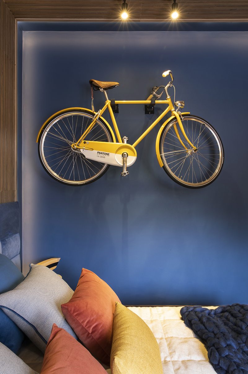 Reconhecida por mesclar cores, texturas e materiais, Adriana Fontana propõe uma combinação de cores complementares, como o laranja e azul, para uma sensação de acolhimento. O pórtico em formato de U é revestido de cerâmica com aspecto amadeirado e a bicicleta na parede, reforça a ideia de que o quarto é de um viajante.