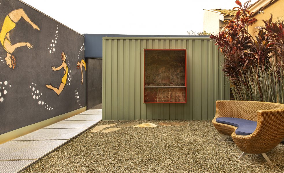 Texturas naturais e formas que dão sensação de movimentam integram o espaço de 50 m². A passarela metálica permeável desenha o caminho para os visitantes. O grafite na parede, inspiração dos anos 1920, mostra o salto de uma nadadora. A bilheteria é revestida com patchwork de MDF de várias cores.