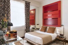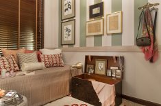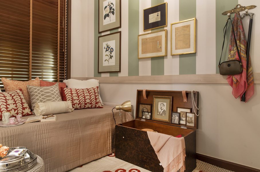 Para romper com a estética tradicional da terceira idade, Mariana Ciciarelli optou por listras com cores vibrantes que preenchem duas paredes e o teto. Ao abrir a caixa de recordações da família, Mariana expõe objetos do acervo pessoal, com livros, kit de chá de porcelana, caixas e até os boletins escolares de seus avós. O rodameio de madeira que circunda o quarto ganha a função de apoio para os moradore. O piso original da casa foi preservado e coberto por dois tapetes sobrepostos, um de sisal e outro com detalhes alaranjados.