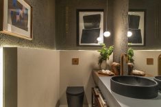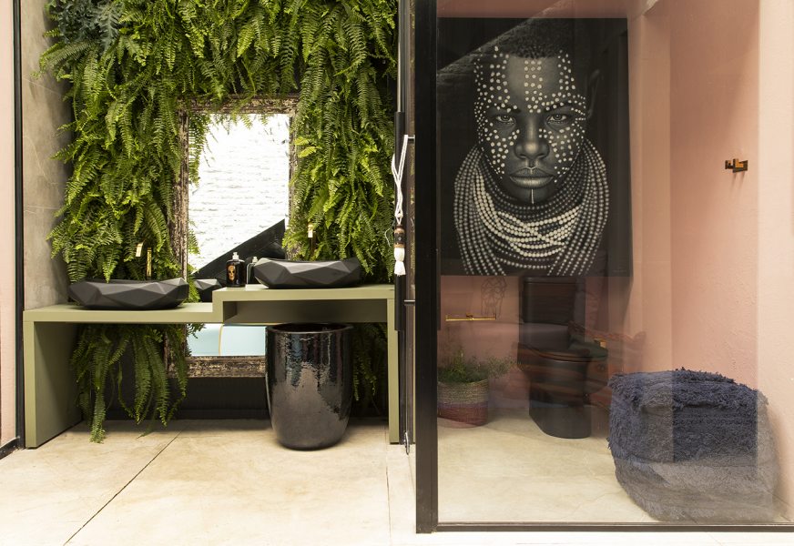 O ambiente unissex, o tom rosa aparece como predominante, mostrando que cor não tem gênero. O nu artístico nas fotografias exibe corpos fora dos padrões de beleza. Os retratos aparecem em uma estrutura de vidro revestida por uma película transparente inteligente, que fica opaca quando a luz é acionada e permite o uso dos sanitários com privacidade. A parede verde sustenta orquídeas brancas em meio a samambaias.