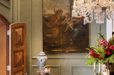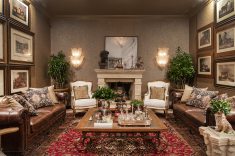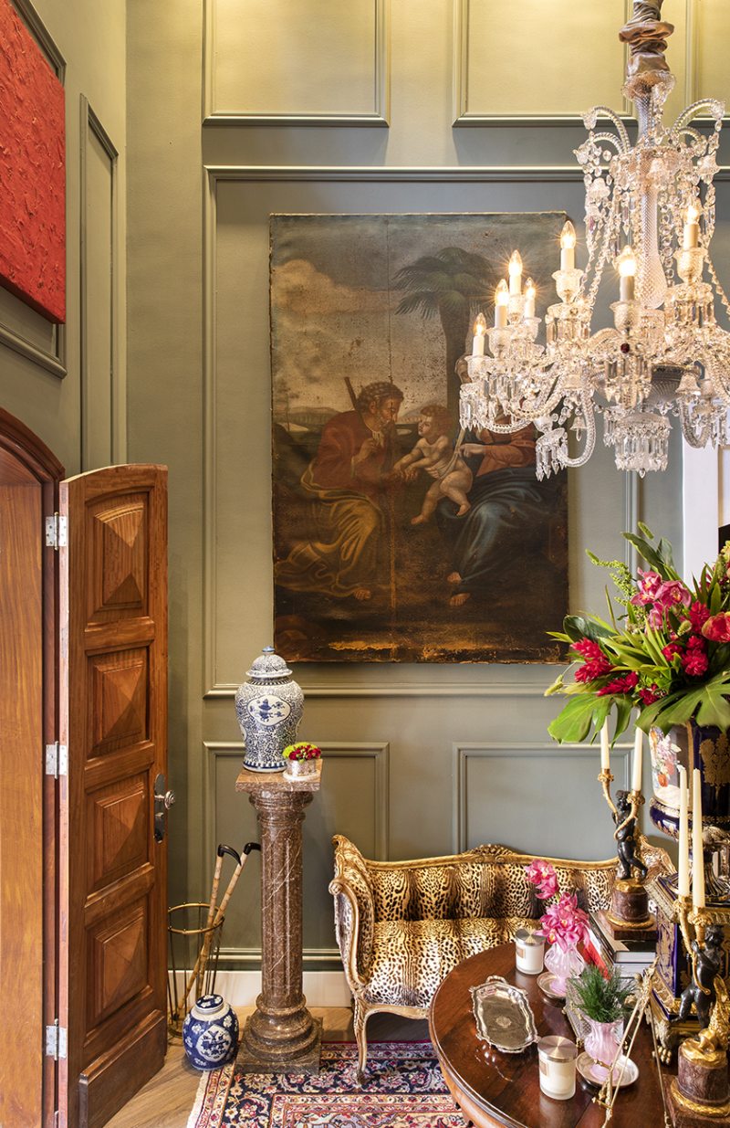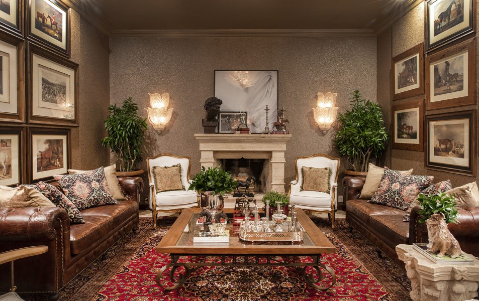 Este living de 60 m² traz como destaque o contraste entre estampas florais e geométricas, que revestem as poltronas e almofadas e dois sofás Chesterfield. Os lustres e arandelas de vidro murano compõem o decor, junto com fotografias e esculturas de cavalos.