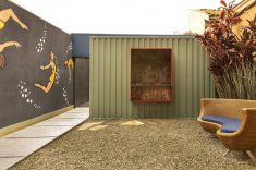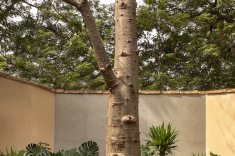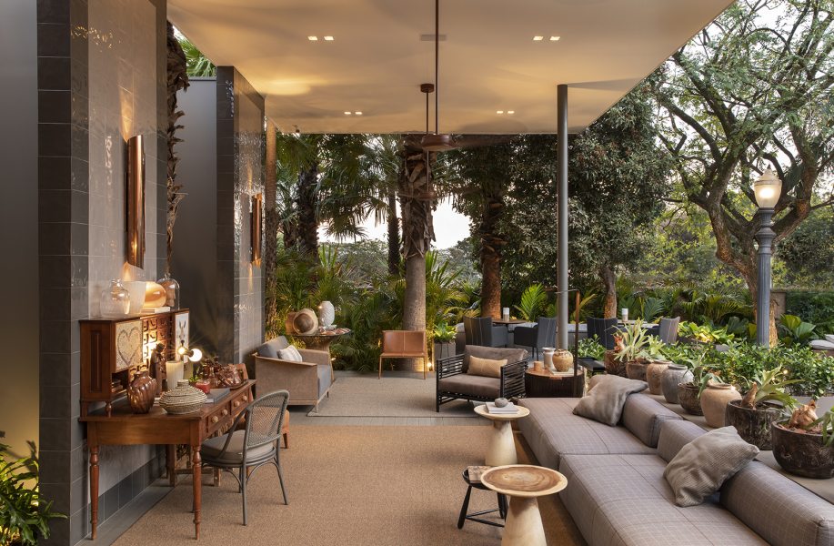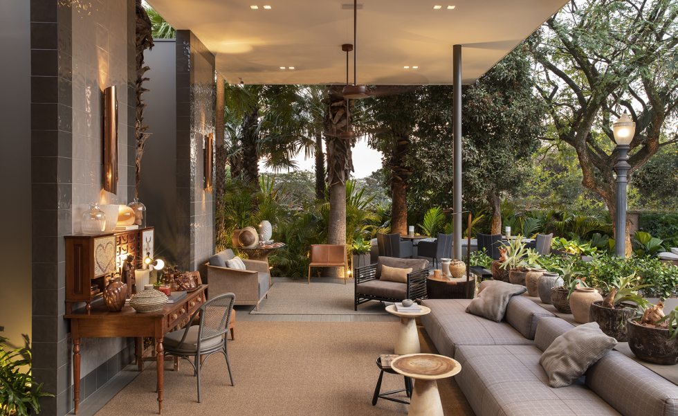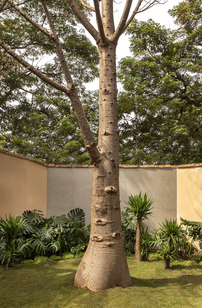 Com mobiliário e décor minimalistas, o jardim conta com o ipê rosa e o baobá originais preservados. O paisagista Marcelo Faria agregou texturas tropicais com outras espécies como xanadu, costela de adão e fórmio. O gramado zeon é ideal para clima seco e dispensa manutenção. Os móveis Mac em tons escuros trazem design contemporâneo.