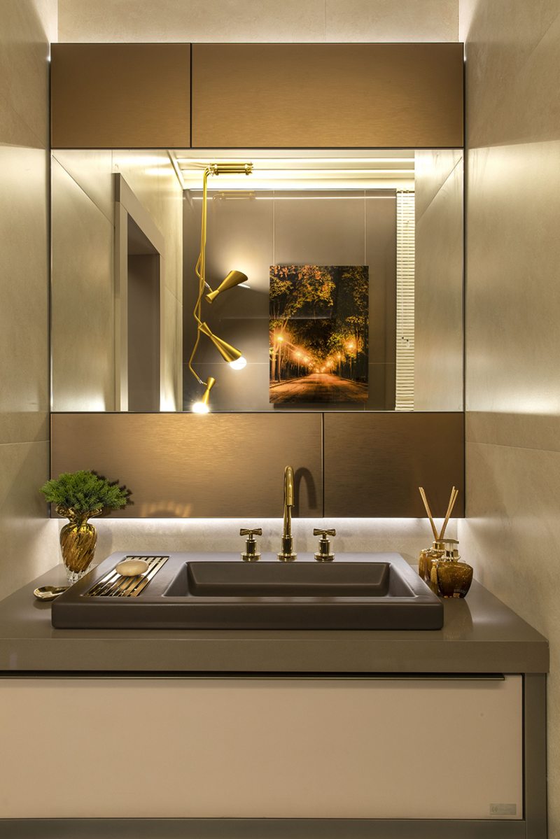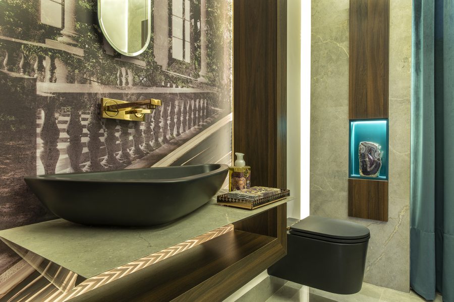 O sistema solar é a referência deste ambiente assinado pela arquiteta Rosana Ferreira e a engenheira civil Fernanda Cândido. Representado pelo revestimento em porcelanato, com o brilho das estrelas no painel de Swarovski, iluminado por fitas de LED. A luminária, com lâmpadas redondas, simboliza os planetas e um grande espelho dourado, o sol. Por trás da bancada, uma cascata automatizada é acionada ao ligar a torneira.