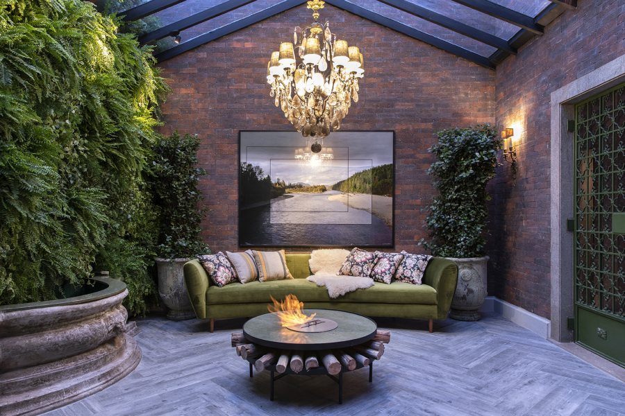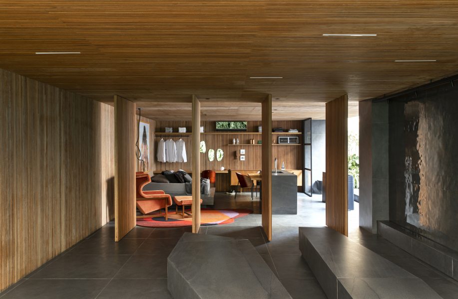 Inspirada pelo movimento do calidoscópio, Mariana Orsi integra área de eventos e estúdio com porcelanato escuro e madeira. Uma parede de água dá vida a um dos fechamentos do espaço. Destaque para peças assinadas por brasileiros no mobiliário. Na área externa, dois pergolados de vidro fazem companhia ao jardim vertical, composto por vegetação nacional.