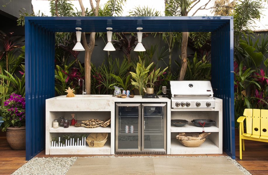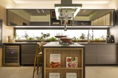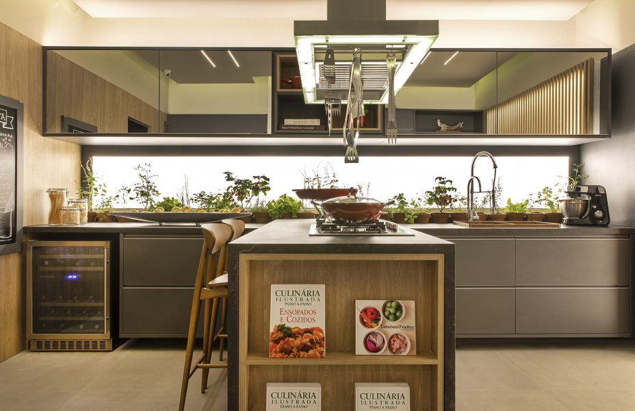 O ambiente foi feito para um chef de cozinha que reúne a família durante as aventuras gastronômicas. A horta de temperos ao alcance das mãos e piso que dispensa manutenção demonstram isso. Os tons de cinza são destaque e garantem atemporalidade.