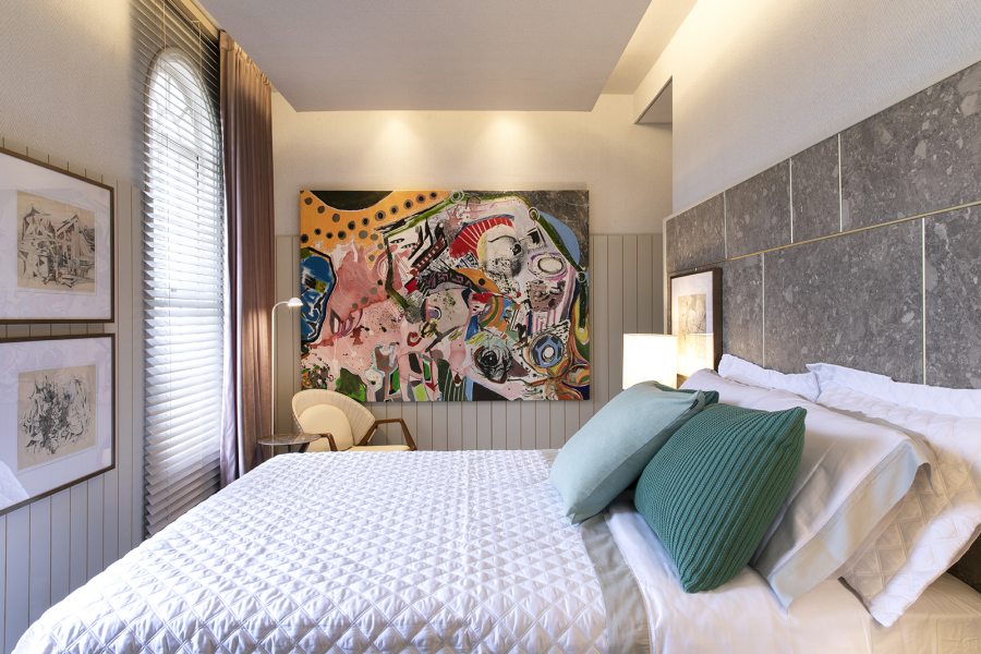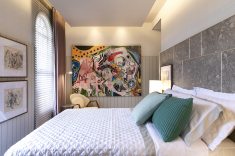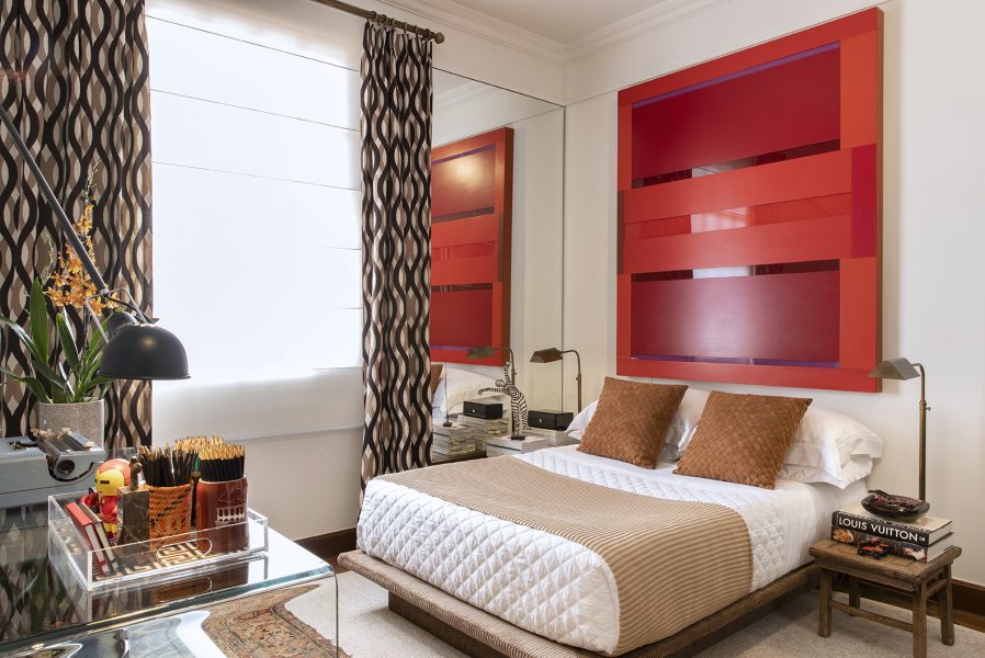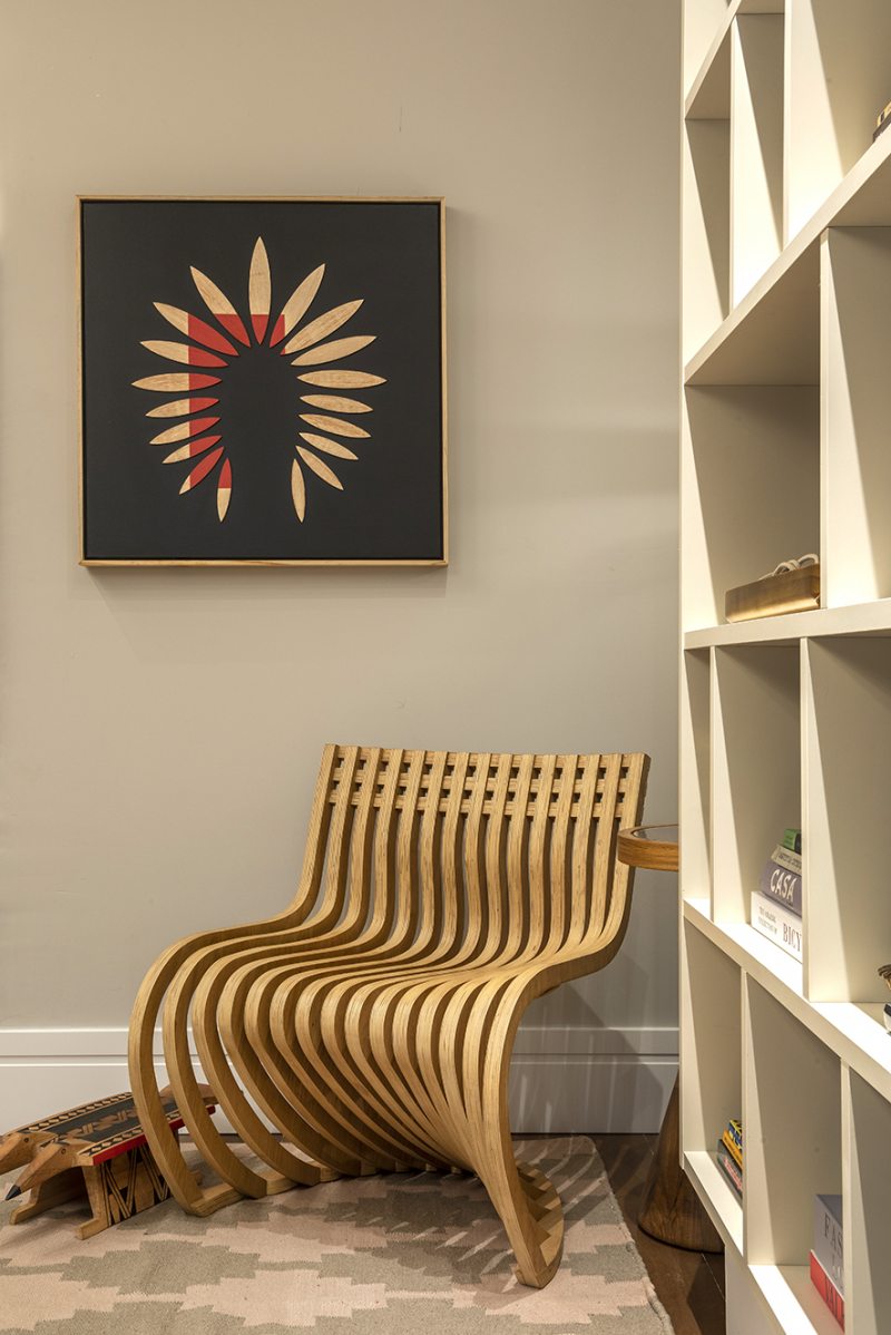 Com hall, dormitório, closet e escritório integrados, os arquitetos Thiago Manarelli e Ana Paula Guimarães buscaram peças que transmitem harmonia, como o painel de madeira que nivela toda a marcenaria. O papel de parede chevron em zigue-zague leva estilo até o teto. A surpresa fica por conta da pintura de Carlinhos Brown, que pela primeira vez expõe uma de suas obras, de temática abstrata, em uma mostra.