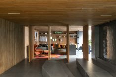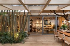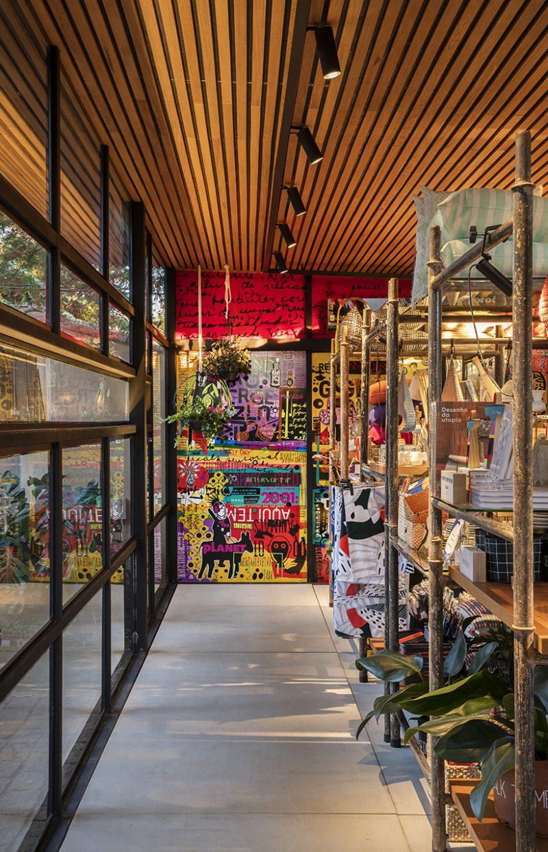 Inspirados no tema da mostra 2018, A Casa Viva, os elementos construtivos são desmontáveis e serão reimplantados. Os arquitetos Matheus Benetti e Dariane Bertoni, também designers de produto, optaram por elementos prosaicos das construções. Materiais industrializados são ressignificados e aparecem a olho nu. Andaimes sustentam placas de madeira e dão forma aos suportes para exposição de produtos. Paredes de vidro proporcionam leveza e fluidez.
