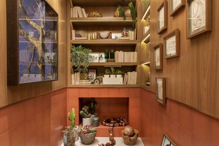 Dulce de Figueiredo Ferraz e Thácia Balbão aliaram elementos naturais com design contemporâneo. O nicho embutido na parede substitui o bar. Obras de arte de Michael Weasley, Pierre Verger e Cristina Canale destacam-se no ambiente. A madeira é protagonista do ambiente, contrapondo com as cores laranja do teto e do tapete desenhado pela dupla. Espécies de guaimbês e crótons dominam o verde, distribuído em arranjos pela sala.