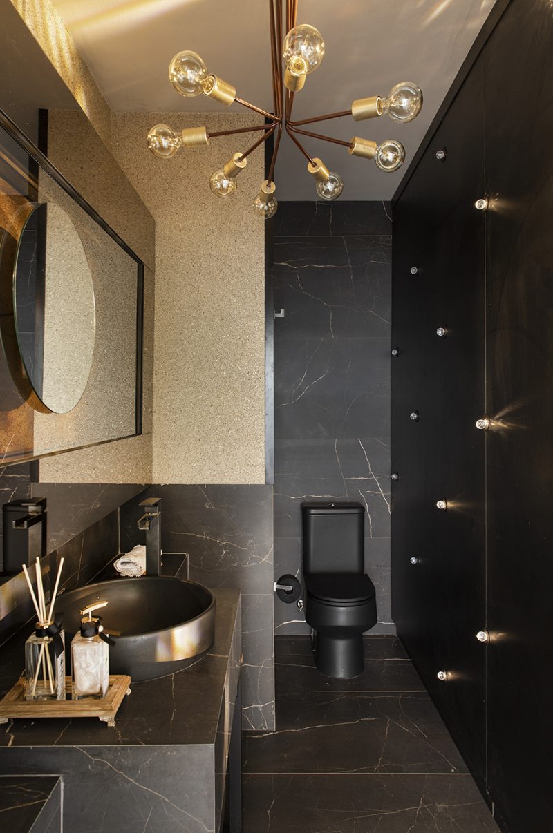 Receber bem o hóspede com um espaço clean e aconchegante é a proposta da designer de interiores Érica Marina. O mármore de desenho exótico destaca-se junto com revestimentos em porcelanato marrom e bege. As tonalidades também estão nas bancadas e louças, e o dourado pontua nos metais e no Garden seat. Foto de uma trilha e vasos com vegetação garantem o toque de natureza no projeto.