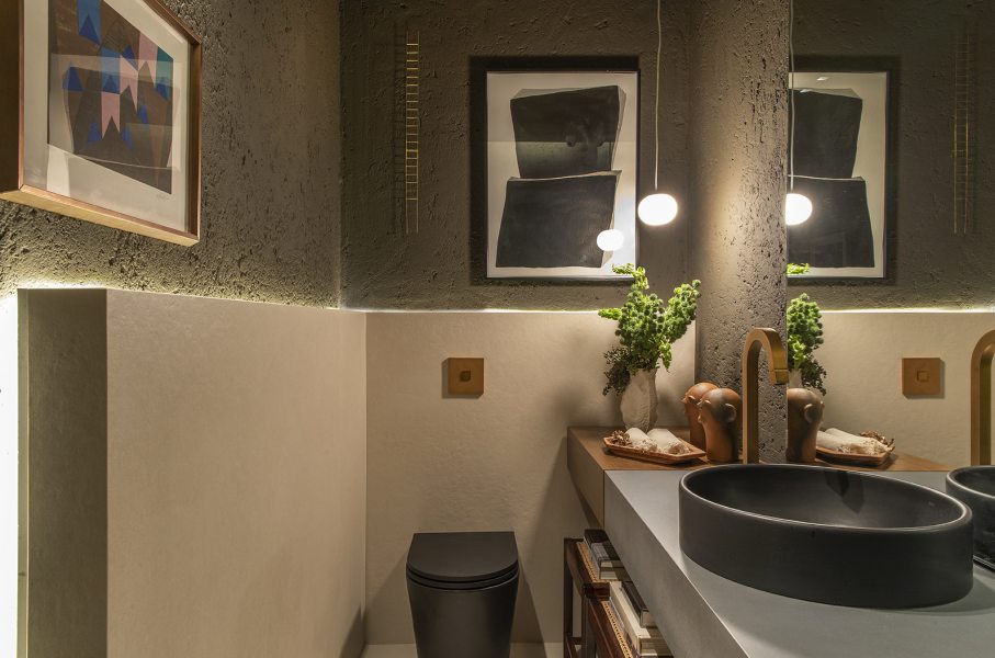O uso de pedras, madeira e cimento rústico proporciona uma imersão no universo natural. A madeira em tom cappuccino substitui o forro de gesso e complementa o tampo feito com porcelanato de aspecto metálico. Nas paredes, o rústico ganha textura com reboco sarrafeado artesanal e pintura em tom fendi. As louças pretas e metais dourados garantem sofisticação.