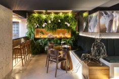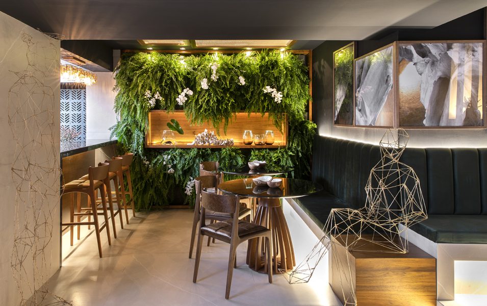 Tons de madeira, pedras naturais, tecidos e texturas compõem este espaço inspirado em Milão, Copenhague e Amsterdã. O restaurante mescla os ares europeus com a brasilidade representada pelo cobogó assinado pelo arquiteto Guto Requena. E também no jardim tropical, com bromélias e bananeiras.