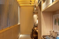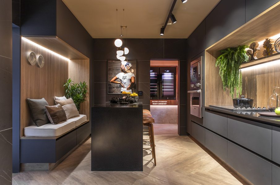 Bruno Castanhari, Diego Buzato, Gustavo Pinto e Marco Castro oferecem uma experiência sensorial aos visitantes, com textura aveludada no revestimento e na marcenaria. Os armários e paredes possuem tons escuros, que contrapõem com o tom do piso, que possui paginação em escama de peixe. O pendente Jabuticaba, de Ana Neute, dá um visual arrojado à cozinha.