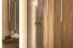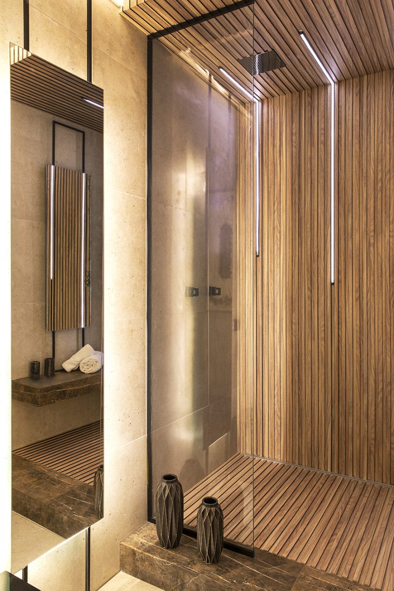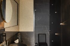 A transição da infância para a adolescência inspirou os profissionais a projetarem um ambiente arrojado. Os espelhos são posicionados em três faixas fixadas por estruturas metálicas no teto e no chão. Os tons sóbrios garantem uma atmosfera masculina. O piso aparece em sintonia com metais e louças escuros, e o preto como destaque. A madeira, apropriada para áreas molhadas também é usada como revestimento.