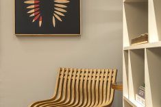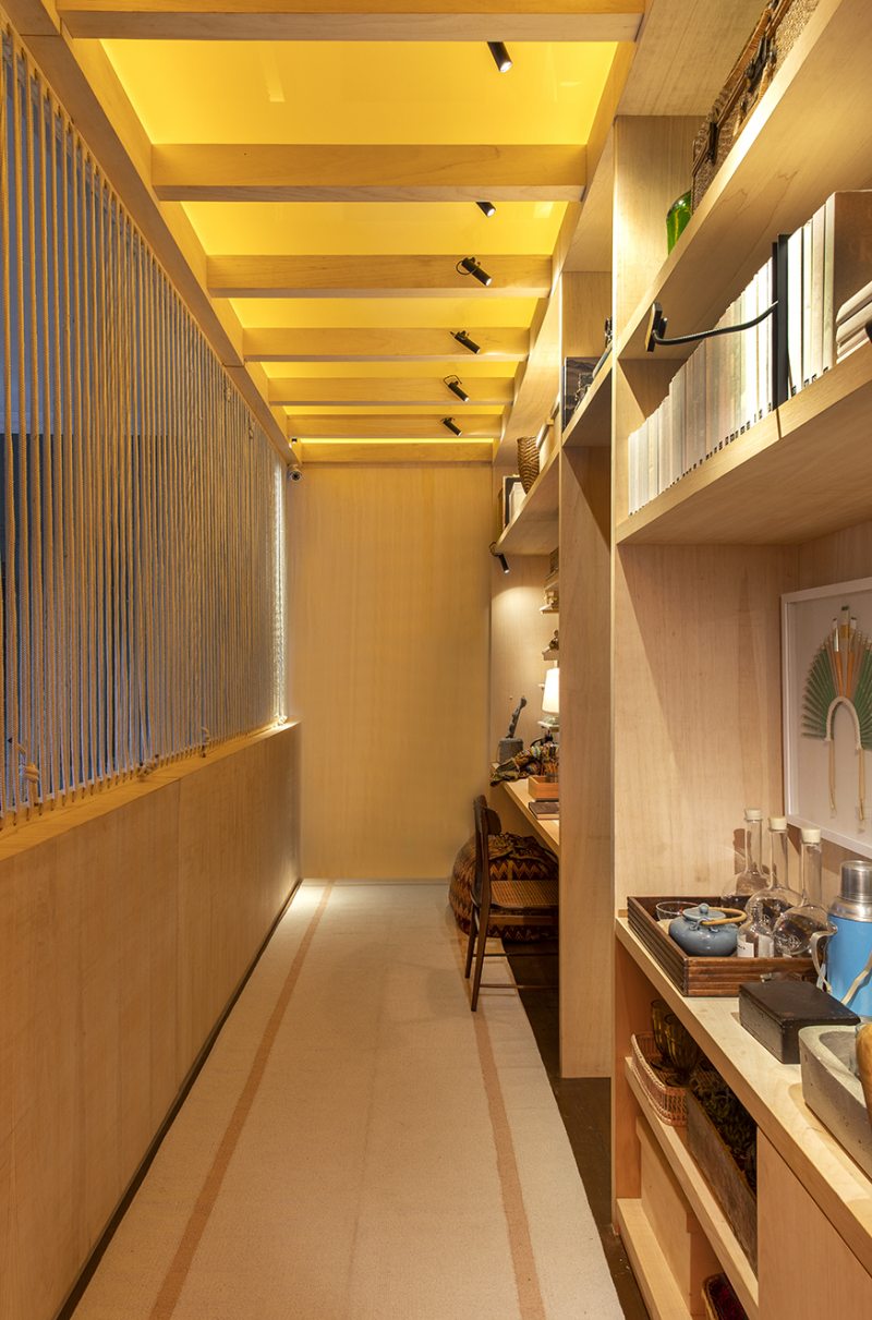 Para este ambiente, a porta e o acoalho da escada foram mantidos, acompanhado por um mobiliário que mescla peças contemporâneas e de garimpo. Na decoração, foram usados cocares e itens de artesanato indígena. Um tapete persa legítimo é sobreposto a uma tapeçaria de fibras naturais.