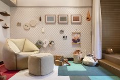 13 luminárias artesanais feitas de papel se destacam no quarto da criança. Os arquitetos Mariana Hetem e Pedro Code criaram um ambiente sem gênero definido. Fugindo das peças infantis tradicionais, criaram um universo lúdico, mas com cores neutras. Com todas as peças de designers nacionais, evocam a natureza através de um grande painel com motivos da fauna brasileira e uma instalação de luminárias decoradas por folhas de eucalipto e flores de primavera desidratadas. Um tablado com esconderijos secretos na marcenaria substitui a cama convencional.