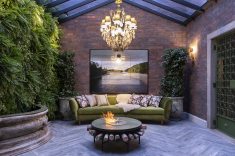Os arquitetos Adriana Zein, Adalberto Montagnani e Ana Paula Mendes usaram os elementos da natureza para criar um jardim de inverno que traduz o tema A Casa Viva. O estilo moderno predomina no mobiliário, com destaque para a peça assinada por Rodrigo Ohtake. Mas, a poltrona Luiz XC, as arandelas e os lustres franceses criam o contraste entre estilos. O paisagismo mistura referências de jardins europeus mas com espécies tropicais.