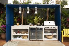 Integração familiar com a natureza. Essa é a proposta do espaço assinado pela designer de interiores Sarita Ávila e o arquiteto Marcelo Tamassia. O paisagismo no ambiente, que contorna o pergolado de alumínio sob o qual fica a bancada, insere a cozinha gourmet em meio à floresta. A madeira é o elemento base do projeto: está na mesa, assinada pela designer, que abraça a pitangueira nativa da casa; no sofá modular e na mesa de centro.