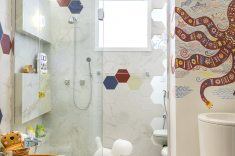 Inspirada pelo método pedagógico de Maria Montessori, a designer de interiores Lucéia Ambrózio propõe um ambiente autônomo para as crianças. Um suporte permite o alcance da cuba da bancada, barras deslizantes adaptam o chuveiro à altura e suportes de apoio dispensam ajuda de adultos no banho. Os tons de branco e chamois estão nas louças. No teto, o forro de gesso tem formato de uma casinha, iluminada por fitas de LED.