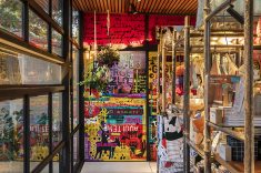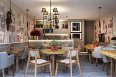 Inspirado pelo designer de festas Renato Aguiar, Alexandre Calil propõe dinamismo e leveza para o projeto. Paredes de tecido com pinturas artesanais de estantes de livros compõem o bar. A madeira de demolição aparece nos tampos das mesas e piso em porcelanato com aspecto amadeirado. O balcão de mármore cinza se equilibra com pontos verdes e mobiliário neutro.