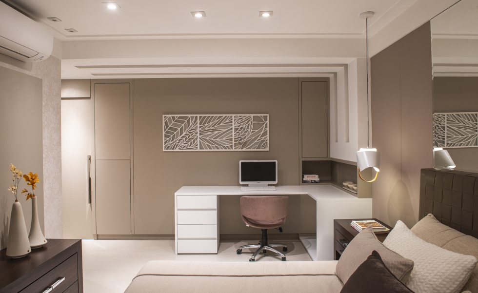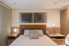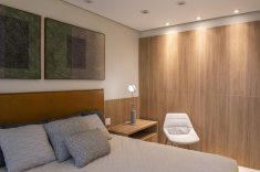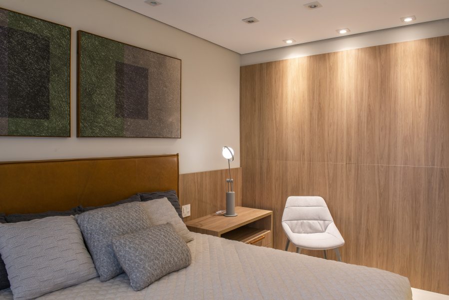 A suíte de hóspedes e a suíte máster deste apartamento no bairro Batel, em Curitiba, contaram com peças da Grey House e paleta de cores suave para compor o décor elegante desejado pelos moradores. A arquiteta Ísis Virmond, encarregada de renovar os dois dormitórios com área total de 67m², decidiu investir na iluminação cênica como ponto de destaque.