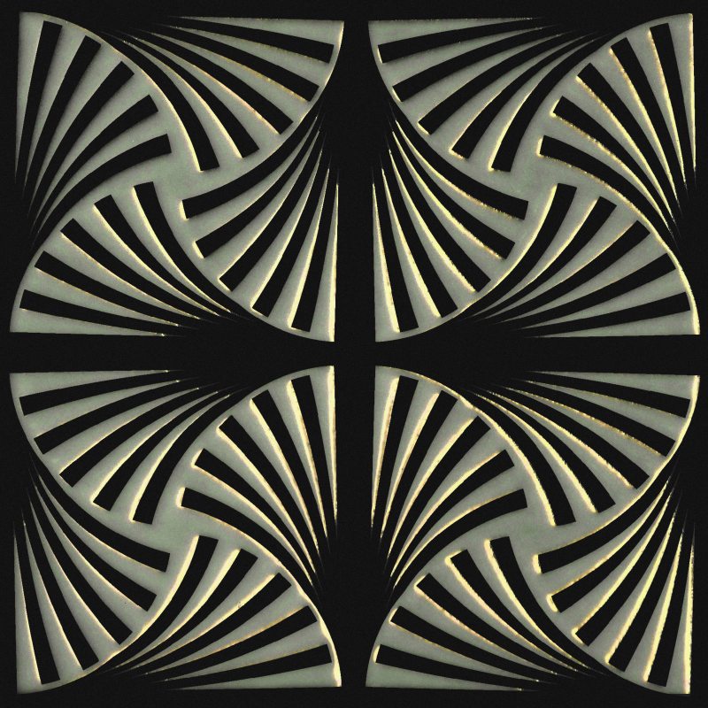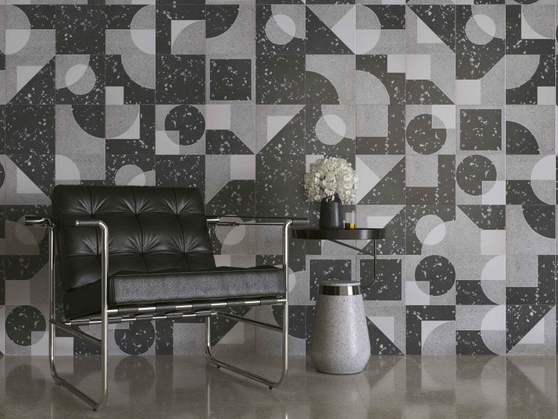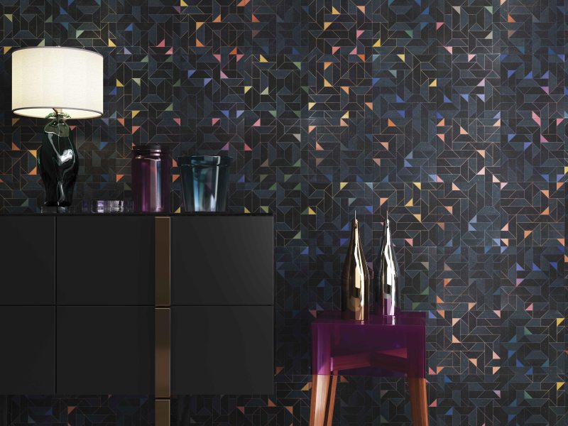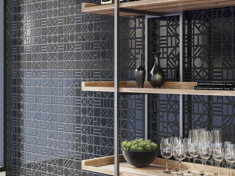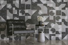 Os revestimentos dessa linha mostram uma composição descontraída de elementos geométricos em alto-relevo. Os grafismos branco, preto ou prata, valorizam o fundo preto mate.
