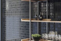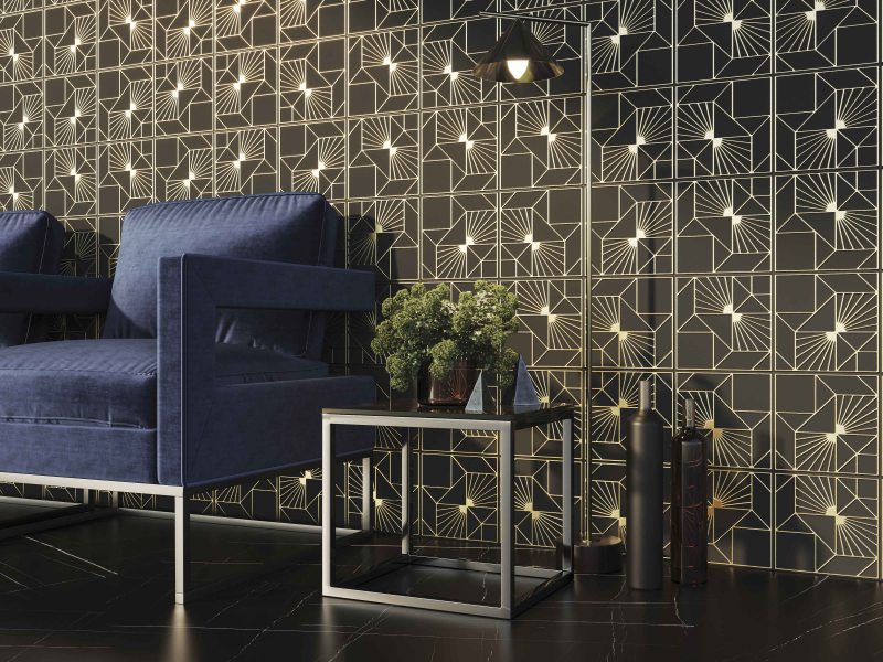Sinônimo de sofisticação e imponência, as cores metalizadas são o destaque do Gatsby. Os revestimentos foram inspirados no movimento Art Déco, que em sua essência oferece elementos em ouro, bronze e prata sobre bases neutras. Os grafismos geométricos, de finas linhas retas em tons metálicos, valorizam o fundo mate nas cores branco ou preto. A trama de fios metálicos se expande sobre a superfície e é evidenciada pelos efeitos da iluminação.