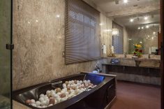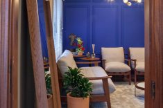 O ambiente foi criado no Hotel Mabu Curitiba Business, localizado nos arredores do principal centro cultural da cidade, o complexo Teatro Guaíra. Com 60 m², o espaço estava desocupado e mantinha as características originais do projeto. Em apenas 10 dias, o trio de especialistas elaborou o conceito, dentro das necessidades do Festival de Curitiba, repaginou a estrutura e criou um projeto de design de interiores com uma ampla pesquisa das características, estilo de vida, shows e biografia de Bibi Ferreira. “Uma das cores de destaque que utilizamos no espaço é do vestido que ela usou no show da sua última turnê em Curitiba, por exemplo”, explica o designer Gustavo Fraga. O Azul Veleiro destacado no espaço é uma das cores das Tintas Suvinil, bem como o Bege Cortiça. Todos os materiais de construção foram cedidos pelo Balarotti Materiais de Construção.