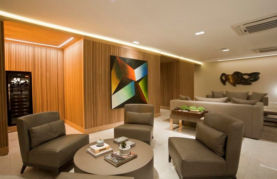“No apartamento decorado procuramos trabalhar com tons neutros que ressaltam a sofisticação e nobreza dos materiais (mármore branco, limestone, ônix branco e os painéis em madeira carvalho). O mobiliário é minimalista, destaque para a poltrona Greek e Sofá Flex em veludo mushroom. A Chaise Austral, um ícone da Artefacto, é a representação das linhas limpas propostas. Com a adega iluminada em ônix que se abre para o living, conseguimos trazer uma atmosfera mais aconchegante que se estende para todo o ambiente. No lavabo, cuba de piso revestida por painel de marcenaria ripada.