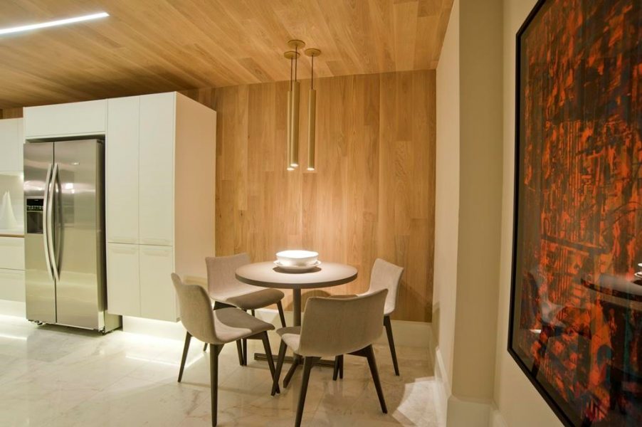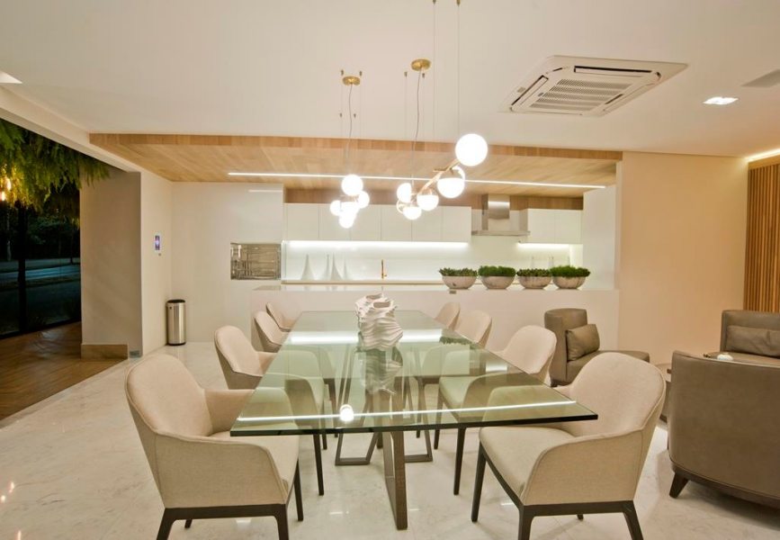 “O conceito do projeto foi pensado naquelas famílias que fazem questão de compartilhar os mesmos espaços. Linhas retas e poucas misturas de materiais constroem a área gourmet, que se debruça sobre o living principal do apartamento. Destaque para a cadeira Bonheur e a Mesa de jantar Asti. Com coluna fabricada a partir de finas chapas recortadas de metal, ela tem revestimento em couro soleta pespontado.”