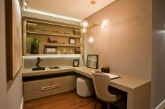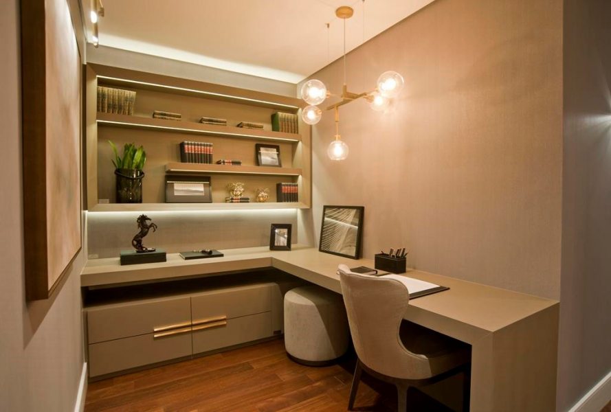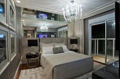 “Cinza, bege e preto compõem a paleta de cores, No quarto dos filhos seguimos uma linha mais moderna e clean, enquanto que no quarto do casal, uso de materiais e objetos nobres como o mármore gris Armani, o lustre em cristal, e a cabeceira em dourado e camurça natural. Os criados Berger – com estrutura em aço inox e acabamento polido, gold ou rosé em high gloss ou louro – também são peças de destaque. Para fugir do modelo tradicional do closet usamos uma linha mais moderna e aberta, integração com o quarto. Com estrutura em aço inox, a Cabeceira Piet tem revestimento central em tecido e abas adicionais em espelho. No estar íntimo, painel em mármore branco e espelho fumê contrastam com os tons. Nos banheiros dos filhos usamos uma linha mais básica, com porcelanato e tampos em Silestone branco. Já nos banheiros do casal predomina a imponência do mármore branco com o requinte dos metais dourados”.