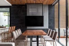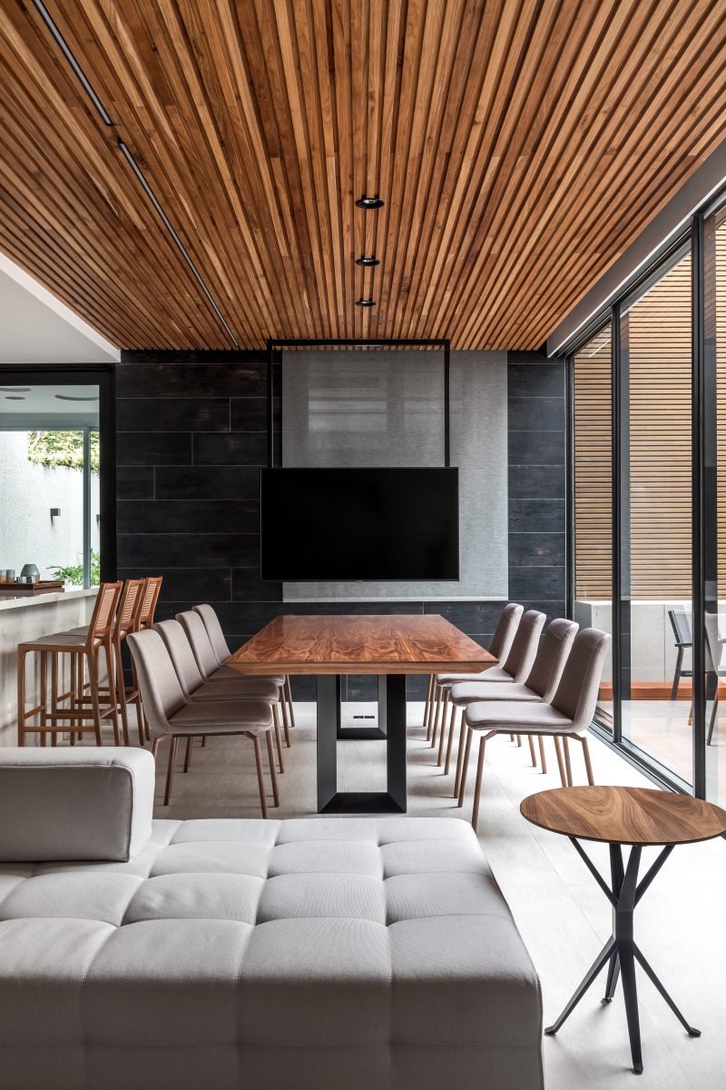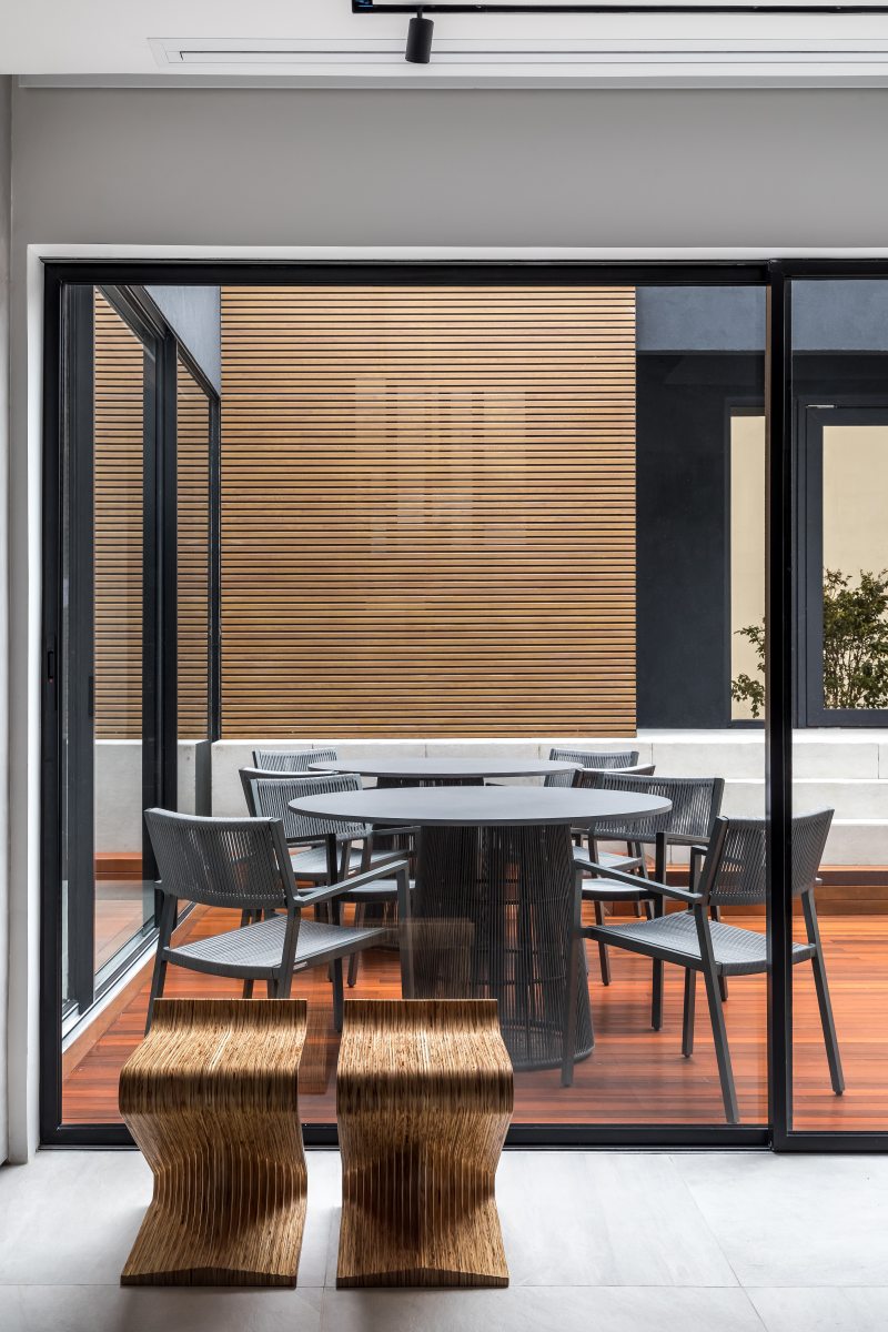 O espaço gourmet, por exemplo, pode ser usado como área de eventos, showroom ou sala de reuniões. Além da versatilidade, a sensação de acolhimento foi outro ponto determinante. “Queríamos que quem estivesse no espaço se sentisse na sala de um amigo ou familiar. A ideia era ser uma proposta de fácil leitura em qualquer parte do país, ou até mesmo fora, para que qualquer futuro cliente da construtora se identificasse, independente de sua origem.” – revelou o arquiteto.