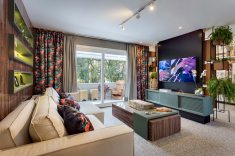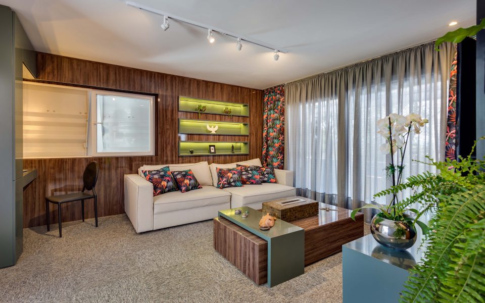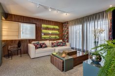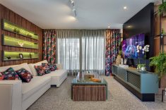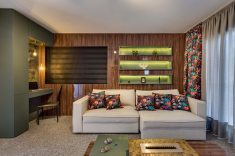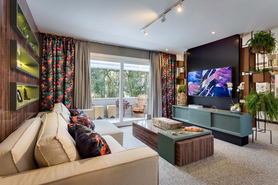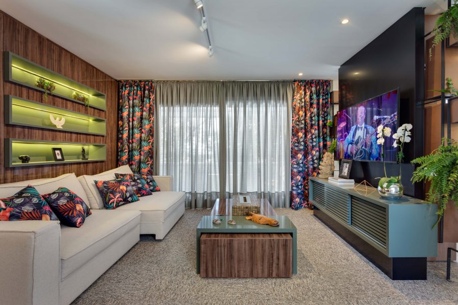 Um espaço de convivência familiar, com cores sóbrias contrastadas por estampas florais coloridas. Assim é a sala de TV projetada pelo Estúdio Pantarolli Miranda, formado pelo designer Diego Miranda e do arquiteto Zeh Pantarolli: “Trabalhamos com tonalidades baseadas na filosofia Feng Shui, focando em tons sóbrios para a paleta principal e cores vivas nos tecidos das cortinas e almofadas”, comentam. O ambiente faz parte da Mostra Container, espaço de 375 m² criado a partir de sete containers que compõem a estrutura da casa.