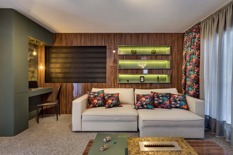 Onde: Curitiba • 25 de Janeiro - 2019 | Fotos Nenad RadovanovicEspaço familiar composto por sala de TV e home office utiliza princípios do feng shui e mobiliário sob medida