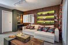 O projeto possui objetos decorativos, lareira ecológica e sofá garimpados na Black Home Design, loja também assina a marcenaria, executada com chapas em MDF da Eucatex que mescla laca amadeirada e verde acetinado. “Gostamos muito da versatilidade e das tendências que encontramos na Black Home Design. Podemos especificar desde adornos de decoração até a execução da marcenaria, que atinge um nível excelente de qualidade e acabamento”, finalizam.