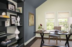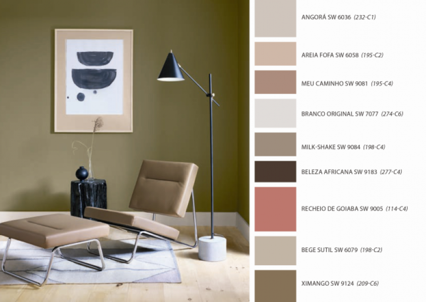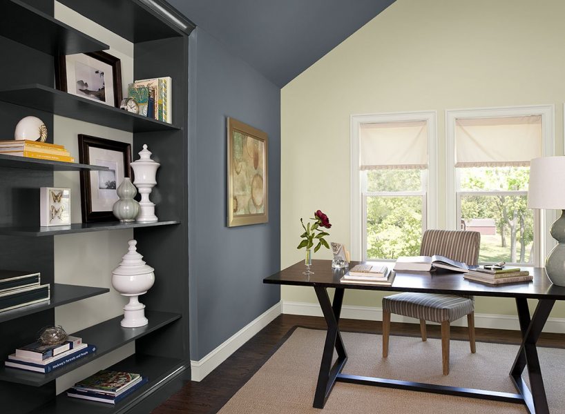 Cores mais escuras e marcantes são extremamente versáteis e podem ser aplicadas em praticamente todo tipo de home office. Nesta proposta o tom terroso Caverna SW 7701, o azul marinho, Naval SW 6244 e o tom Recheio de Goiaba SW 9005 são boas opções. A escolha da cor depende também da combinação com os itens do mobiliário e tecidos, sendo importante selecionar cortinas, mesas, almofadas e tapetes adequados à proposta do ambiente.