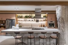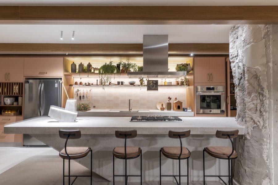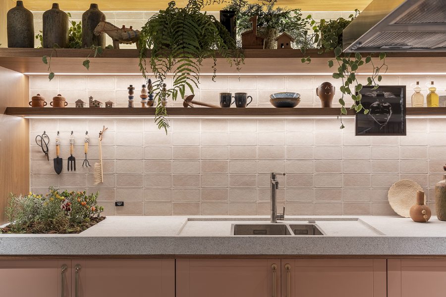 Na Cozinha Funcional de Bruno Moraes, para a Casacor SP, a atmosfera aconchegante é permeada por elementos rústicos e acolhedores. Aqui o profissional optou pelo misturador monocomando de mesa com filtro Twin Click, Deca. Além da possibilidade de acionamento por clique frontal, o metal reúne em uma única peça a água em temperatura ambiente ou aquecida, além de purificador. Com a tecnologia exclusiva Carbon Block, elimina impurezas e até 75% do cloro, mantendo apenas o flúor e sais minerais necessários.