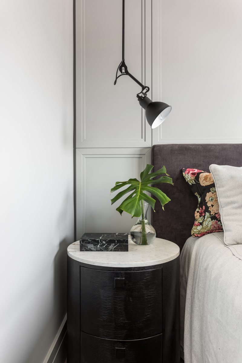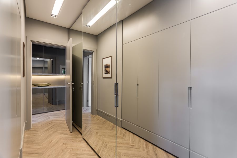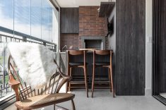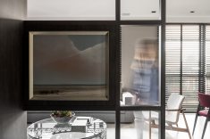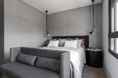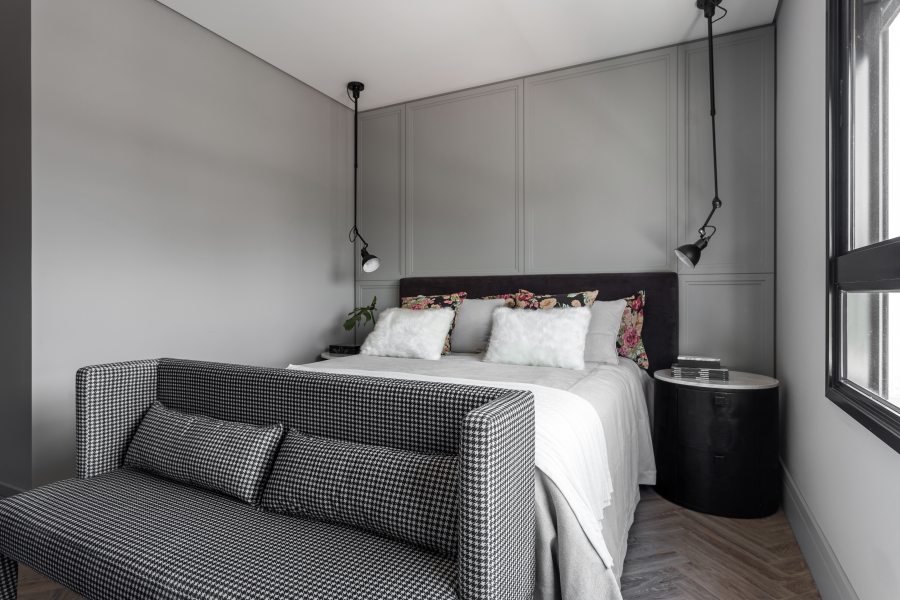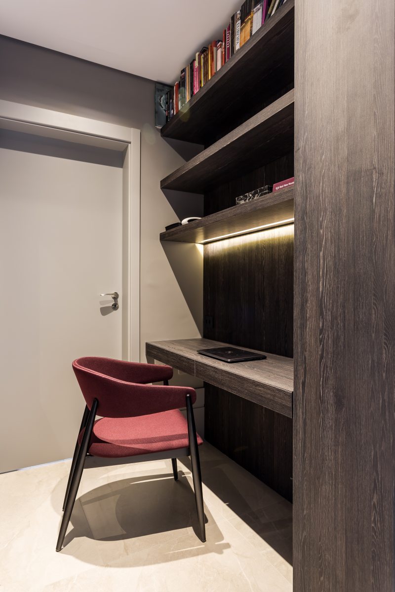 Com a inversão do ponto de TV original, criaram-se as áreas de home office e hall de entrada, que não estavam previstas na planta inicial. “Essa mudança na planta foi realmente marcante e mudou profundamente todo o fluxo e funcionalidade do apartamento. É um diferencial do projeto”, conta Talita.