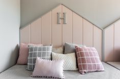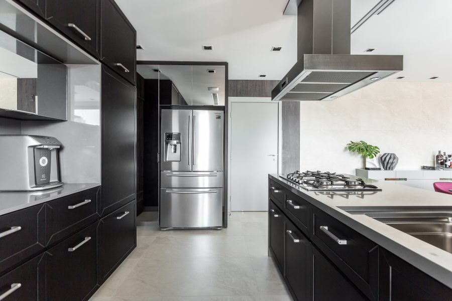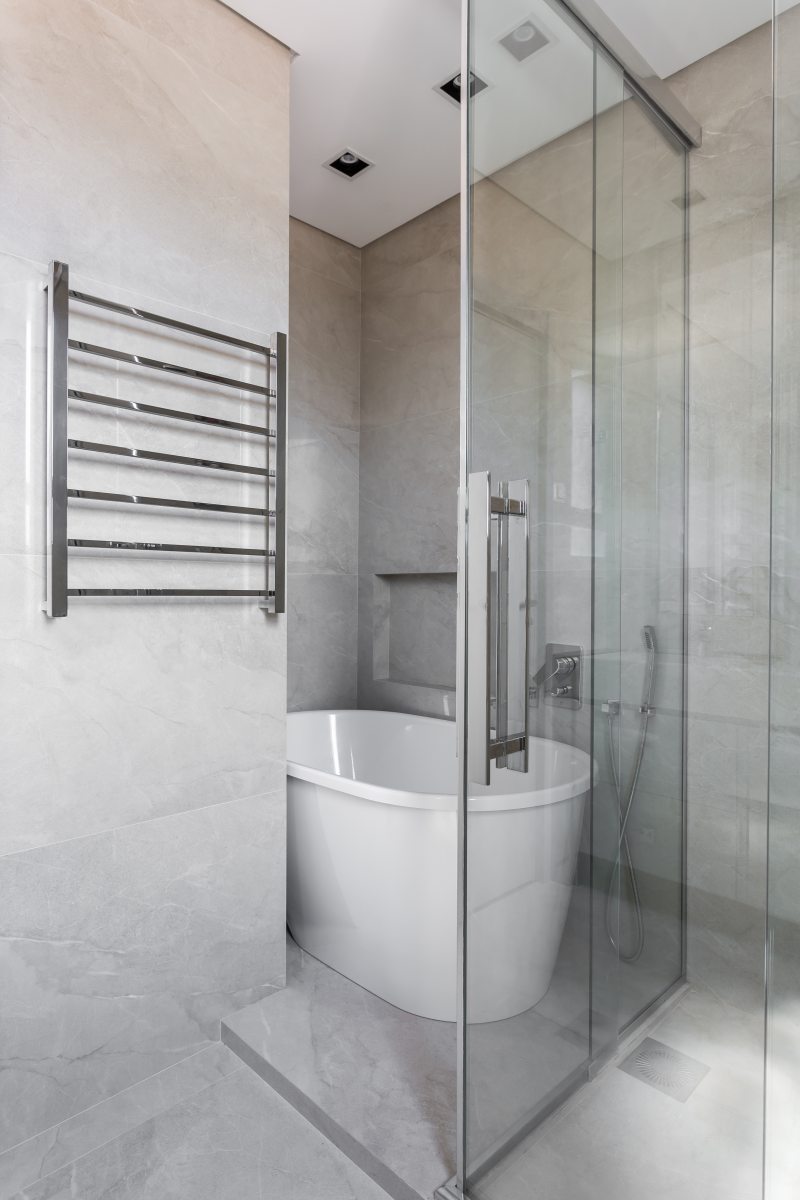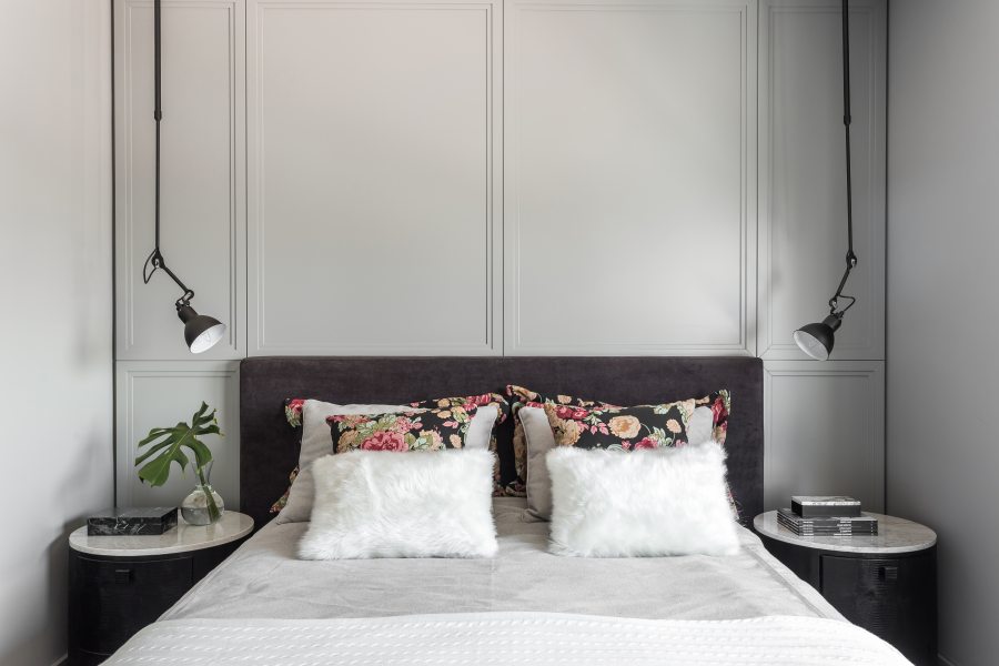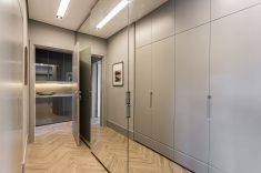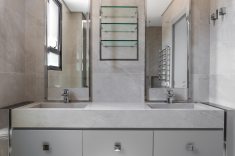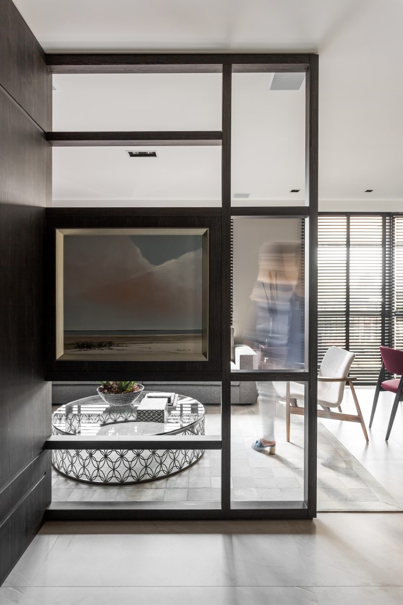 Com a inversão do ponto de TV original, criaram-se as áreas de home office e hall de entrada, que não estavam previstas na planta inicial. “Essa mudança na planta foi realmente marcante e mudou profundamente todo o fluxo e funcionalidade do apartamento. É um diferencial do projeto”, conta Talita.