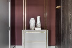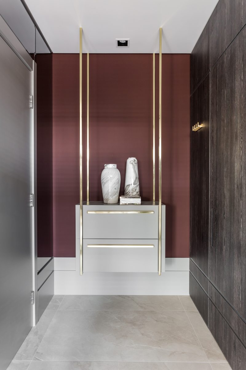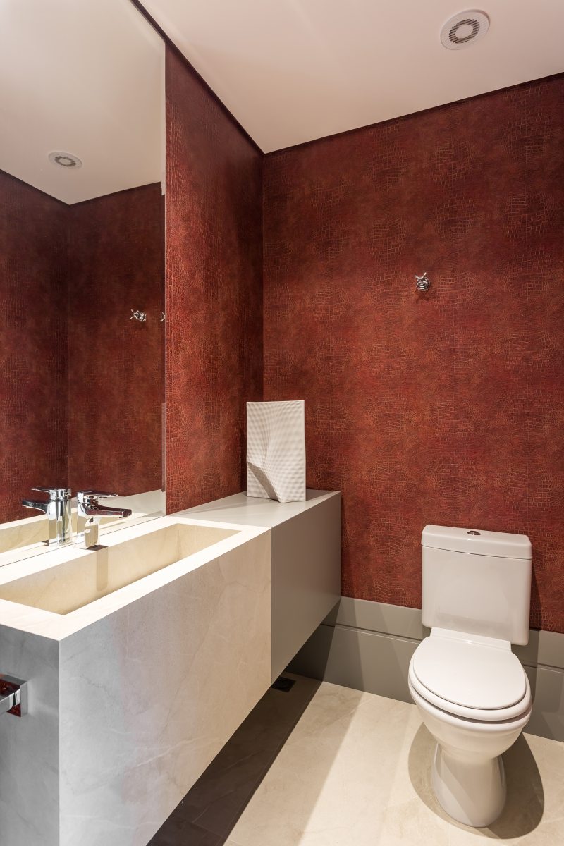 Dentro de um contexto mais atual, o borgonha aquece ambientes e destaca pontos específicos de uma maneira refinada, como no projeto de interiores assinado por Talita Nogueira para um apartamento de 200 m², em Curitiba: “Os clientes queriam que todos que ali entrassem soubessem que aquele espaço era único e muito especial. Depois, identifiquei a preferência pelo borgonha, pelo piso marmorizado e pelo preto e aí a imaginação correu solta!”, conta a arquiteta.