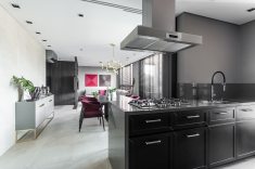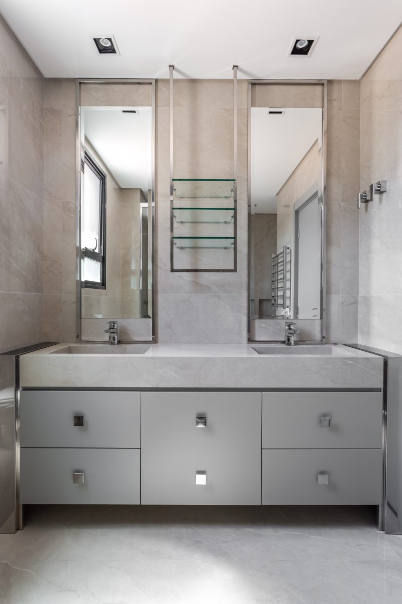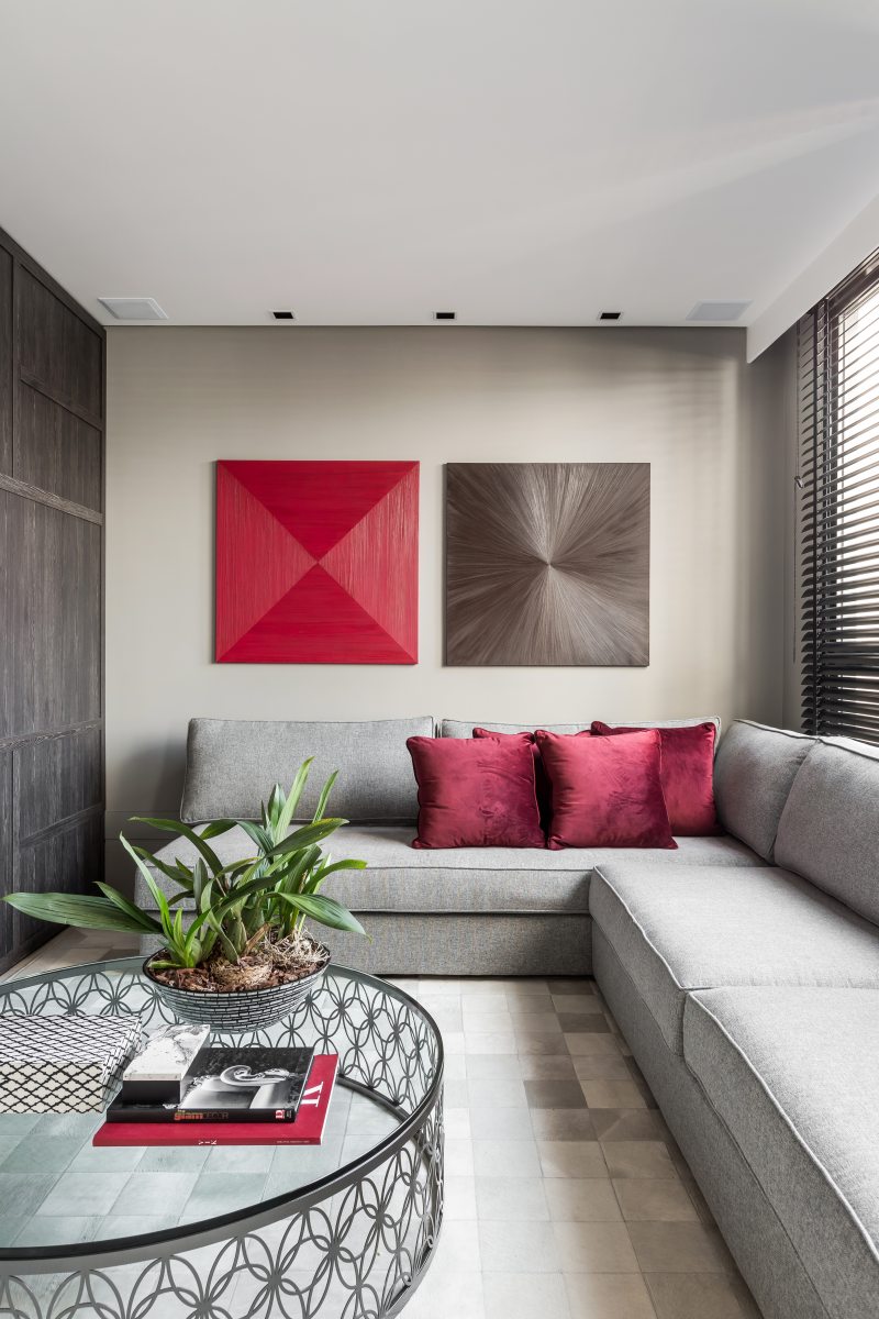 A base atemporal em tons de cinza ganhou vida com a cor borgonha nas almofadas, cadeiras de jantar e quadros. As linhas retas e alinhadas do conceito repetemse no mobiliário, trabalhado em laca cinza e amadeirado preto com espelho fumê, para aumentar a sensação de amplitude dos espaços, com detalhes em latão dourado. A iluminação embutida em LED é indireta, criada para compor cenários agradáveis à noite.