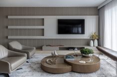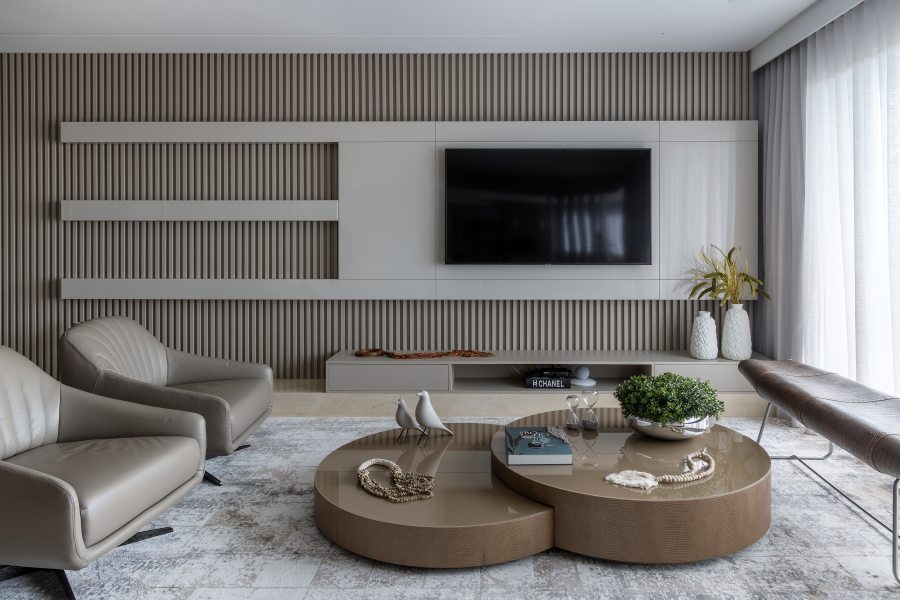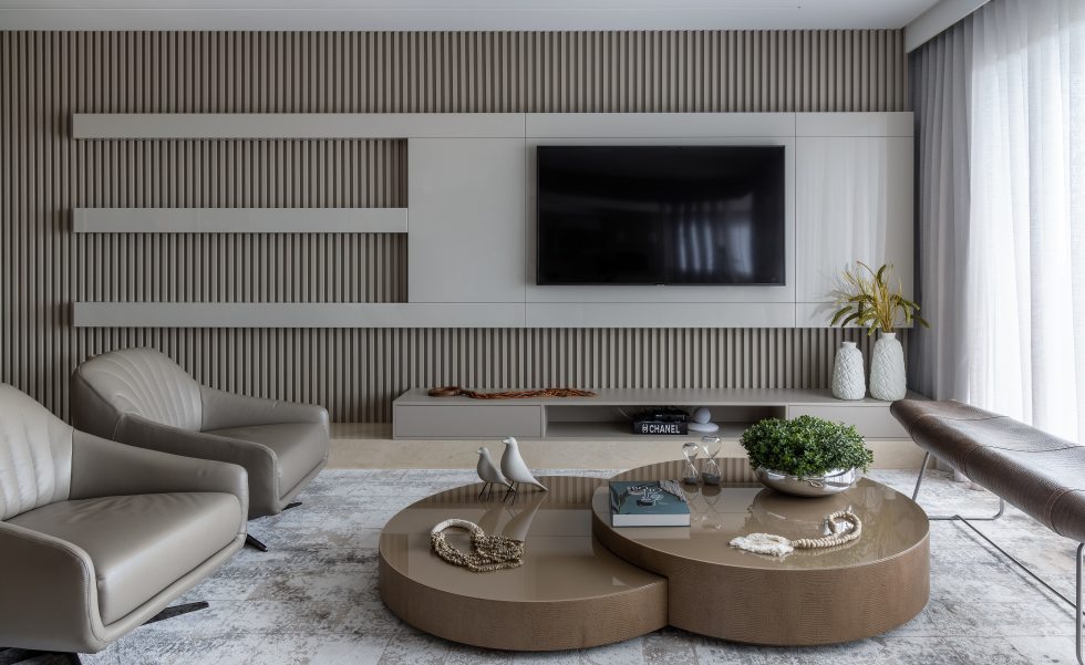 Na sala de estar o painel da TV ganha destaque a partir do jogo de texturas entre o ripado em laca fosca e o elemento geométrico em laca branca alto brilho. O sofá e as poltronas Natuzzi Itália, ambos fornecidos pela Ton Sur Ton, combinam beleza e tecnologia para garantir que o momento “cinema em casa” seja o mais confortável possível. O tapete Naturale harmoniza o décor e integra as texturas dos estofados, acabamentos e peças decorativas à mesma estética elegante.
