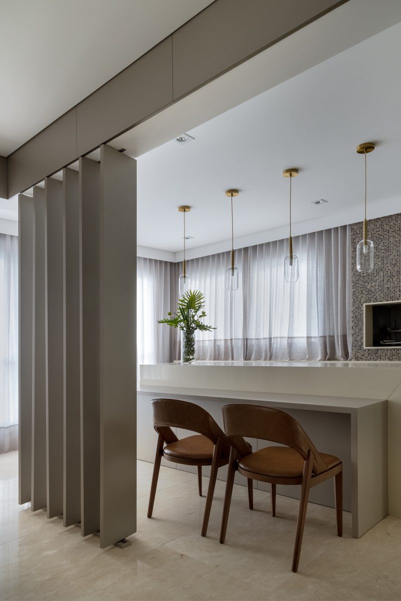 A cozinha é um destaque à parte: a bancada de quartzo de alta resistência, executada pela Bellagran, garantiu a sofisticação e funcionalidade do ambiente. Eletrodomésticos de ponta, fornecidos pela Cevimar, e mobiliário sob medida elegante, garantiram um ambiente digno de chef para a moradora que adora cozinhar. O resultado é uma residência que acolhe e convida a viver bons momentos em família – uma receita para a harmonia.