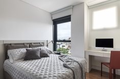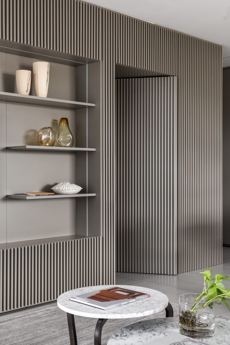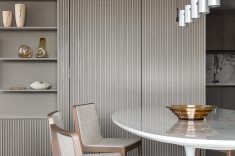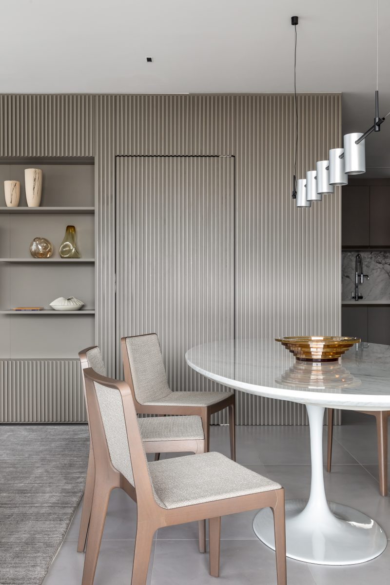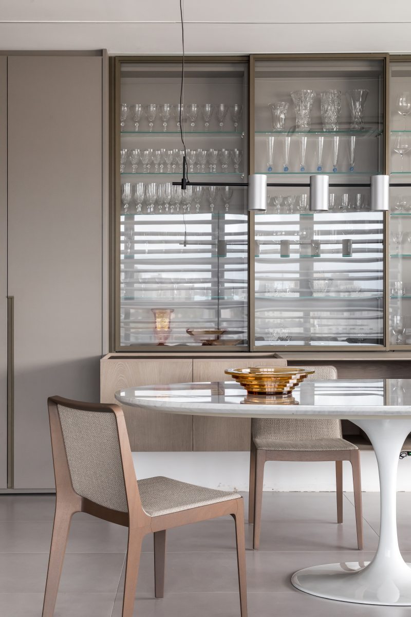 Na sala de estar as poltronas e o sofá com chaise retrátil da Natuzzi Itália, fornecidos pela Ton Sur Ton, garantem o conforto dos preciosos momentos de lazer. O layout integrado, com livre acesso à varanda e à sala de refeições, valoriza a luminosidade natural abundante e a vista privilegiada para o skyline urbano. Elementos em madeira ripada e luminotécnico moderno finalizam este apartamento de aspecto quase zen. Tranquilidade garantida.