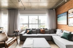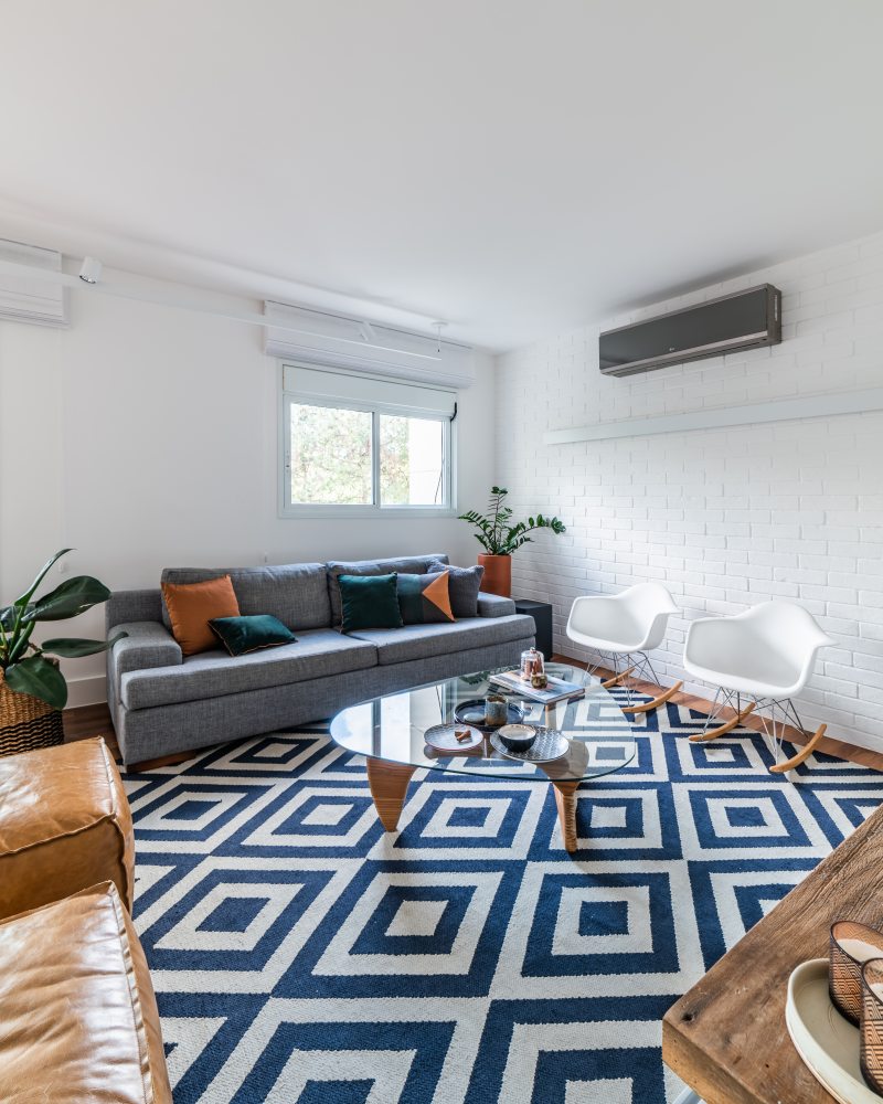 Abaixo: no living, a parede com revestimento de tijolinhos ofereceu amplitude ao brincar com as texturas | projeto: Liv’n Arquitetura
