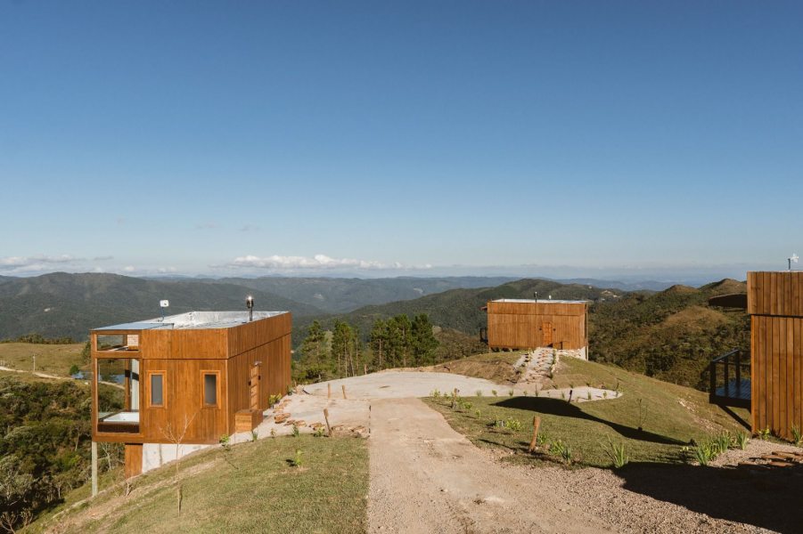 Localizado em Anitápolis, a poucos quilômetros de Florianópolis, o complexo Vistas de Anitá adota uma arquitetura pensada para não competir com o entorno. As cabanas ocupam um terreno privativo de 28 hectares e foram implantadas para preservar vistas abertas da serra, garantir privacidade e reforçar a sensação de isolamento — sem perder conforto ou qualidade construtiva.