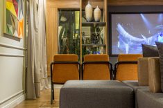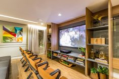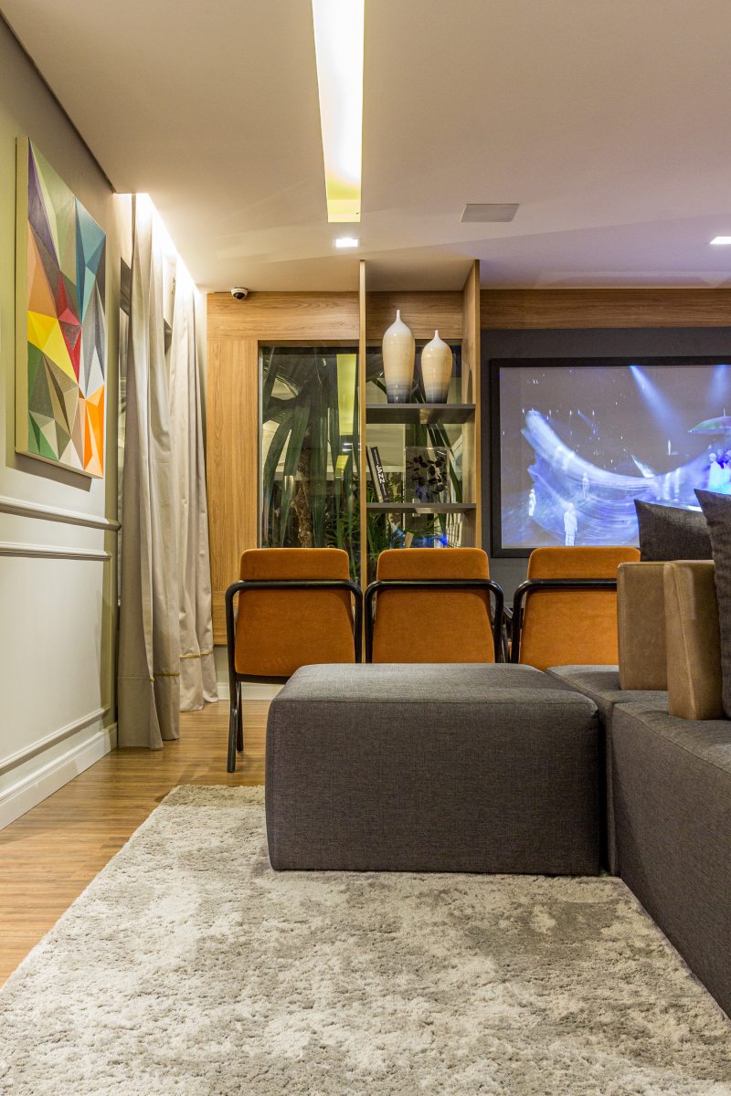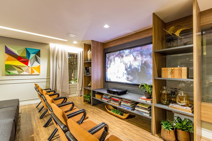 Pensando nos momentos de lazer que a sala de TV proporciona, o projetor transmite a sensação de cinema em casa. Mas em vez de sair do teto, como acontece normalmente, Simone trouxe uma nova proposta, com um display que simula uma TV de 120 polegadas e ainda possibilita a visualização na claridade. “A tecnologia e a nova rotina dão o tom do décor”, finaliza.